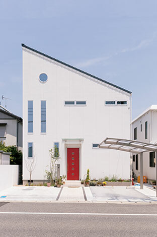 片流れ屋根が美しいエッジの効いた外観 赤い玄関ドアがアクセントになっている イエタテ